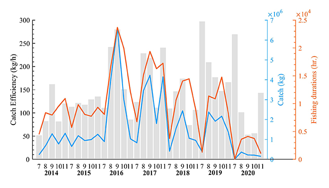 北太平洋柔鱼是重要的大洋性经济头足类种类,传统的柔鱼渔获量统计或常用的单位捕捞努力量 (CPUE)等指标在指示海洋生物资源丰度方面存在一定偏差。研究团队将船舶日志的实际捕捞量与通过自动识别系统(AIS)定位获得的捕捞时间进行综合分析,引入了“捕捞效率(CE)”新指标,可以更加准确地对捕捞作业行为进行评估,从而更合理地反映柔鱼的资源丰度。通过系统分析西北太平洋亲潮延伸体区域柔鱼的捕捞效率(图1),研究揭示了捕捞效率的时间(图2)和空间变化特征,发现该海区柔鱼的资源丰度存在显著的季节与年际变化。此外,通过建立捕捞效率与局地水团分布、叶绿素浓度以及浮游动物生物量之间的关系,指出可通过捕捞海区内多重环境因素来推断当地柔鱼的资源丰度。