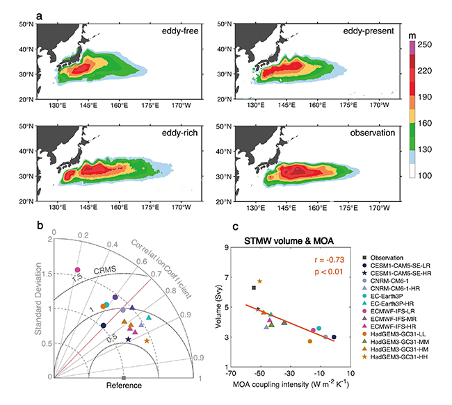 图1:(a-b)CMIP6 HighResMIP模式中不同空间分辨率对北太平洋副热带模态水厚度与空间分布特征模拟的影响。(c)北太平洋副热带模态水体积与中尺度海气耦合强度的多模式间关系。