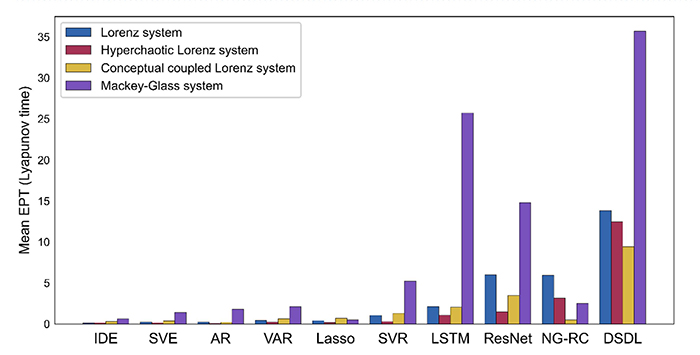 图2:DSDL方法与多种动力学、深度学习方法在四种不同混沌动力系统中预测性能的比较