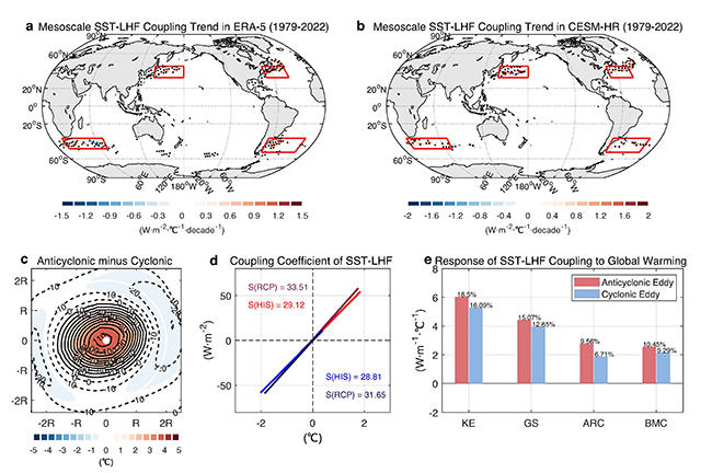 图1.(a,b)冬季ERA-5 再分析资料和CESM-HR模拟的中尺度海温 (SST)-潜热通量(LHF)耦合强度的变化趋势。(c)CESM-HR中历史时期涡旋对应的海温和潜热通量异常。(d)历史(1956-2005)及未来时期(2063-2100)西边界流海区冷暖涡旋两倍半径内的中尺度海温-潜热通量耦合强度。(e)未来与历史情境下的中尺度海温-潜热通量耦合强度的差异,红色代表暖涡,蓝色代表冷涡,从左至右依次为黑潮延申体、湾流、厄古拉斯回流及巴西-尔维纳斯汇流。