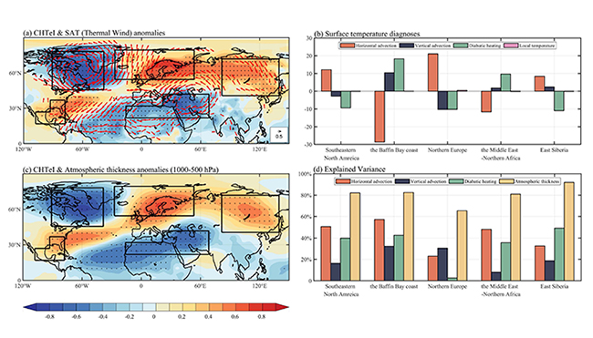 本研究创新性地将遥相关与极端冷事件联系起来,使用遥相关方法研究北半球陆地冬季TN10p的遥相关,发现了TN10p环半球遥相关型—CHTe (Circum−hemisphere teleconnection of extreme cold events )。研究指出,CHTe有五个活动中心:北美东南部、巴芬湾沿岸、北欧、中东-北非和东西伯利亚,五个地区TN10p存在负位相的变化,且具有显著的年际(~3a)和年代际(~10a)变化特征(图1)。此外,CHTe与几种已知的大气(如NAO等)和海洋模态(如NAT等)在发生年份、时间变化和空间结构等方面也存在显著差异,具有相对独立性。研究还发现当发生CHTe时,对流层的中高层存在一个新的大气环半球遥相关型,我们将其命名为CHT (Circum−hemisphere teleconnection )。对CHT进行温度诊断后发现,与“水平平流”、“垂直对流”和“非绝热加热”相比,CHT主要通过调制CHTe 五个区域的大气厚度异常来影响局地TN10p的异常变化(图2)。