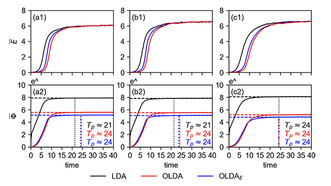 图1:(a1) LDA(黑线)、OLDA(红线)和 OLDAE(蓝线)算法估计的Lorenz63系统变量x的平均绝对误差(E ̅)增长。(b1)和(c1)与(a1)相同,但分别针对Lorenz63系统的变量y和z。(a2)、(b2)和(c2)与(a1)、(b1)和(c1)相同,但分别针对初始误差的相对增长平均(Φ ̅)。水平虚线分别代表三种算法饱和值的99%水平,垂直虚线分别代表相应的可预测期限(T_p)。
