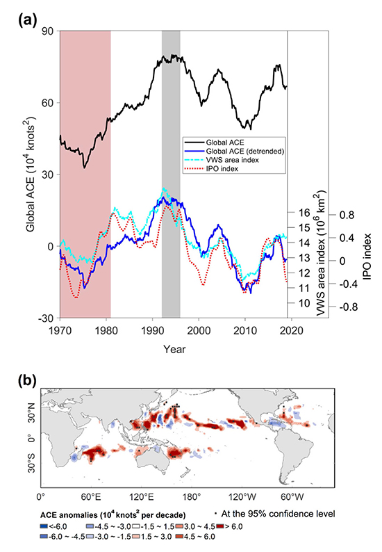 图1. (a) 60个月滑动平均的全球ACE(黑线)及其去趋势部分(蓝线)、弱垂直风切变面积(青色)和IPO(红色);(b)1992-1996年平均的ACE异常空间分布。1981-2019年的平均被扣除。北半球取6-10月,南半球取12-4月。具体请参考Shan et al. (2025)