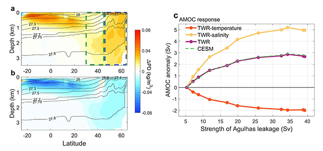 图2. 大西洋的温盐变化对AMOC的影响。厄加勒斯溢流增强后,由(a)盐度升高和(b)温度升高引起的大西洋位势密度的变化。(c)AMOC强度的变化(紫线)与大西洋温度变化(橙线)和盐度变化(黄线)对AMOC强度变化的贡献。
