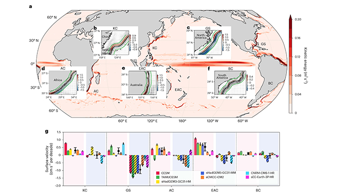 图:a,基于七个高分辨率气候模型1950至2050年全球海洋表层洋流的平均动能。b-f,五个副热带西边界流的表层速度线性趋势(cm/s每十年)。g,五个副热带西边界流在不同模型中向岸(颜色填充)和离岸(线填充)两侧1°内的速度趋势平均值。黑色圆圈(星形)表示西边界流向岸(离岸)侧的多模型集合均值。