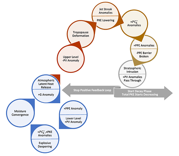 图2:北美炸弹气旋演变能量学过程总结示意图。示意图展示了2022年12月北美炸弹气旋的炸弹性加强正反馈循环的停止信号是由与正反馈循环本身相同的因素引起的。蓝色表示正反馈循环中的步骤,红色表示与潜热相关的位势涡度异常偶极子的另一部分,从红色到灰色的过渡表示潜热效应积累并导致正反馈循环停止信号的过程(以灰色表示)。