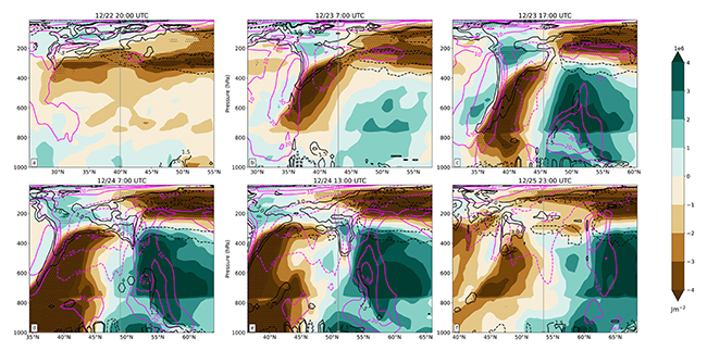 图1:PPE、PV和风速的剖面。沿2022年12月北美炸弹气旋的中心位置(灰点和灰线为参考)展示了PPE异常(阴影,J/m2)、PV异常(黑色等高线,PVU)和风速异常(紫红色等高线,每10 m/s)。a-f分别表示第一次炸弹气旋出现时间(2022-12-22 20:00 UTC)、最大炸弹性加强的时间(2022-12-23 07:00 UTC)、炸弹性加强的结束时间(2022-12-23 17:00 UTC)、PKE趋势转折时间(2022-12-24 07:00 UTC)、最低中心气压时间(2022-12-24 16:00 UTC)和最终炸弹气旋出现时间(2022-12-25 23:00 UTC)。零等高线已省略。异常值相对于1981-2010年气候态。