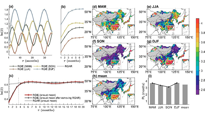 图1:(a–c)SCSP的相对误差演化曲线和相对全局吸引子半径。(d–h)东亚地区季节性降水可预测性期限的空间结构(月);(i)不同季节SCSP可预测性期限的空间平均值(月)。