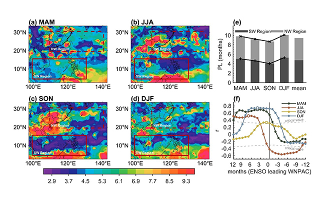图2:(a–d)西北太平洋和东亚沿岸850 hPa水平风的可预测性期限空间结构(月)。(e)WNPAC关键区850 hPa水平风可预测性期限的空间平均值(月)。(f)WNPAC-ENSO的超前滞后关系。
