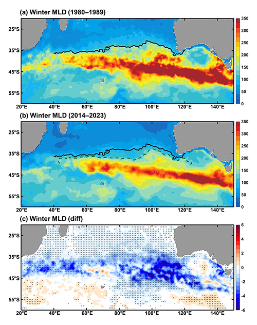 图2:南印度洋冬季深混合层深度(MLD)在(a)1980-1989和(b)2014-2023年的平均值以及(c)1980-2023年MLD变化的线性趋势。黑点表示通过95%的置信检验。黑色实线(绿色虚线)表示1980-1989 (2014-2023)年混合层北侧125米等值线。
