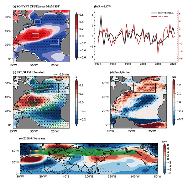图2:(a) 北半球秋季(SON)YFT CPUE与春季(MAM)北大西洋海表温度异常(SSTA)的相关性分布图。(b) SON YFT CPUE与MAM NATI的标准化时间序列。(c) 基于MAM NATI回归的MAM SST、海平面气压(SLP)和风场异常分布图。(d) 同 (c),但为降水异常。(e) 同 (c),但为200 hPa位势高度(GHT)异常。黄点和绿色曲线分别表示Rossby波源区及其传播路径。