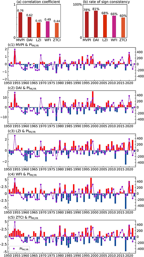 图1. (a) 1951–2023年PIMLYR与五个东亚夏季风指数的相关系数。(b)同(a),但为同号率(%)。(c1)–(c5) 1951–2023年PIMLYR(紫色虚线,右侧y轴,单位:毫米)与五个东亚夏季风指数(MVPI、DAI、LZI、WFI和ZTCI,柱形,左侧y轴)的时间序列。