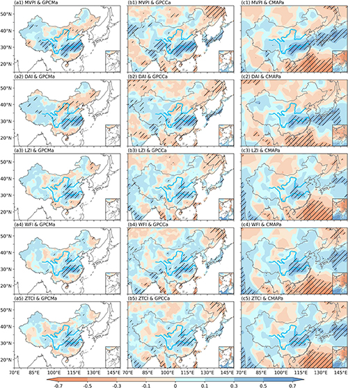 图2. (a1)–(a5) 分别为1951–2023年JJA GPCM降水距平与MVPI、DAI、LZI、WFI及ZTCI的相关系数分布图(阴影表示相关系数)。斜线区域表示基于Student’s t检验通过95%置信水平的显著性区域。(b1)–(b5)与(c1)–(c5)同(a1)–(a5),但分别对应JJA GPCC和CMAP降水距平。