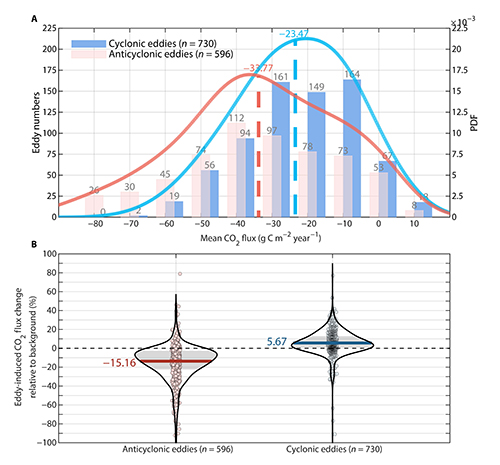 海洋占地球表面的71%,每年吸收约四分之一人为排放的CO2,是重要的气候变化“缓冲器”。中尺度涡广泛存在于海洋中,其水平空间尺度约百公里,对海洋的物质输运和能量交换具有重要作用。然而,由于观测的局限性(通常仅能捕捉到涡旋个例)以及涡旋生命周期的复杂性,长期以来,关于中尺度涡对海-气CO2通量的净效应缺乏系统性认识,这限制了对海洋碳汇准确评估的能力。
