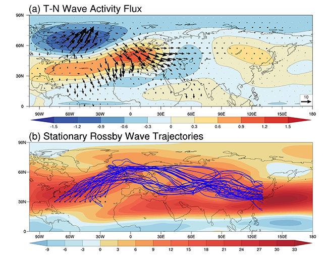 图2:(a) 北半球冬季CHT事件发生时,500 hPa T-N波活动通量(单位:m^2 s^(-2);向量)和QG流函数异常(单位:107 m^2 s^(-1); 阴影)的合成图。(b) 北半球冬季CHT事件发生时的水平非均匀基流下的定常Rossby波的轨迹(蓝色曲线),黑点表示Rossby波源,阴影区为气候平均的500 hPa纬向风(单位:m s^(-1))。