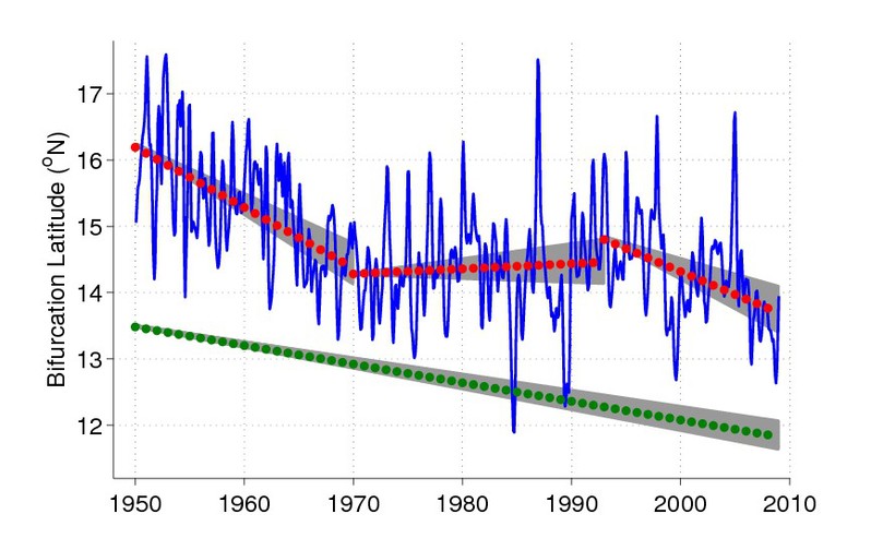 该成果发表在Journal of Geophysical Research 上时,著名的ENSO研究专家Sang-Wook Yeh教授带领的研究团队采用该结论,推断NEC分叉南移所导致的黑潮向北输送暖水增多是上世纪末北太平洋气候转型的一种可能机制。基于该研究工作,我被Nature杂志邀请作为合著者对太平洋西边界流进行综述(Hu et al. 2015,Nature),这是全球物理海洋领域科学家第一次在Nature杂志发表综述文章。该综述就是以太平洋南北赤道流分叉点的变化为主线展开系列论述的,重点阐述了全球变暖对太平洋西边界流的影响,其中本工作发现的有关太平洋分叉长期变化特征及机制被列为该综述的重要成果之一。
