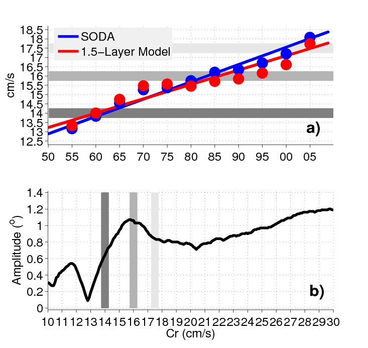 图:(a)由SODA温盐通过WKB近似计算(蓝点)和1.5层数值模式(红点)得到的一阶斜压Rossby波相速度CR。其中直线表示CR在过去60年的线性趋势。由于CR具有明显的季节变化,这里我们只取10年平均后的CR值。(b)线性涡度方程得到的NBL的季节振幅随CR的变化。