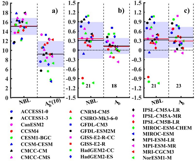 图 多模式风场驱动下1.5层约化重力模型的结果。(a)R1实验组模拟的NBL(°N)平均位置与季节振幅Ab(°)。(b)R2实验组与R1实验组的差。(c)R3实验组与R1实验组的差。图下方对各个模式进行了标注。根据二项式检验,当有17、18、20和22个(总共25个)模式呈现一直变化规律时分别代表通过90%、94%、98%和99%的置信检验。图示中黑线和红线分别代表多模式的平均值和中值,蓝色阴影表示模式间的标准差。