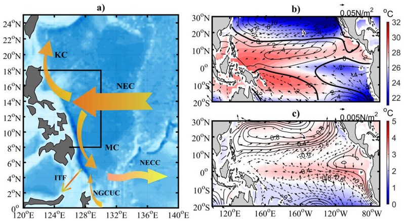 图(a)低纬度西北太平洋环流系示意图。其中NEC:北赤道流(North Equatorial Current);KC:源地黑潮(Kuroshio Current);MC:棉兰老流(Mindanao Current);NGCUC:新几内亚潜流(New Guinea Coastal Undercurrent);NECC:北赤道逆流(North Equatorial Countercurrent); ITF:印尼贯穿流(Indonesian Throughflow)。黑框所显示的区域是工作所定义的NMK系统的断面位置。(b)当前气候情景(1951-2000年)的多模式气候态平均SST(填色)、风应力(箭头)以及风应力旋度(等值线,单位:10-8 Nm-3)。(c)多模式气候态平均SST(填色)、风应力(箭头)以及风应力旋度(等值线,单位:10-8 Nm-3)对全球变暖的响应(2051-2100年平均与1951-2000年平均的差)。