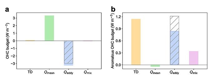 图2:中尺度涡旋垂向热输运减弱导致大西洋深层变暖。(a)1992-2021年平均的大西洋800-1200米海洋热收支诊断结果。从左至右分别为热含量倾向项,大尺度环流热输送,涡旋热输送以及湍流混合引起的热输送。(b)变暖前后热收支的差异。