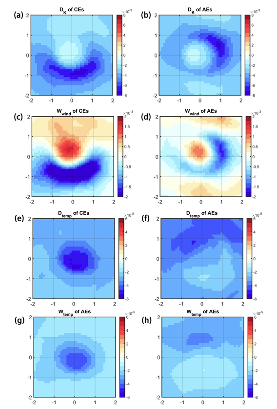 图 1. (a) 合成分析得到的气旋涡动能耗散的水平分布; (c) 合成分析得到的气旋涡由海气动量交换引发的动能耗散的水平分布;(e) 合成分析得到的气旋涡势能耗散的水平分布; (g) 合成分析得到的气旋涡由海气热交换引发的势能耗散的水平分布;右列与左列内容相同,只是将气旋涡换成反气旋涡。