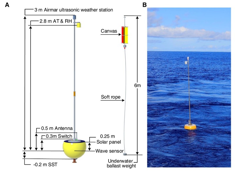DrIB由主浮体、桅杆及水下单元组成(图 2‑1)。其中主浮体直径约0.5m,可提供约30kg的储备浮力,内置控制系统、电源模块及海温传感器。桅杆长约3米,顶端搭载了Airmar超声风速站(观测高度3m)及温湿传感器(观测高度2.8m),用以观测矢量风速、气温、气压及湿度。水下单元包含垂直水帆与重力锚系,两者由6m长钢缆相连,其功能类似机械阻尼器,可扩大水下受力面积,通过反向应力减少DrIB的摆动,使其保持垂直方向。这种结构采用软硬连接,使整个系统更加稳定,避免受力不均导致过度倾斜。此外,特殊的软连接设计可以消除平台的固有频率,避免共振造成的结构损坏。历史浮标姿态数据显示,超过86%的最大俯仰角和横滚角都在30度以下,在传感器的操作范围内。传统漂流浮标具有较强的随流性,其轻质化设计及水帆结构保证其漂流轨迹符合表层(约15m)流场。DrIB则呈现较强随波性,水线稳定,保证了平台姿态及观测精度。