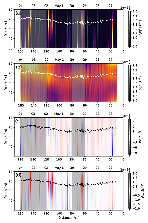 图:(a)水平浮力梯度平方(|Ñhb|2)、(b)垂直浮力梯度(Ñzb)、(c) PV和(d)锋生函数 (Ffront) 的剖面。白色和黑色轮廓表示混合层深度。灰色阴影表示2018年4月29日、5月2日和5月3日