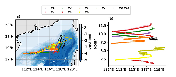 图:(a) 水下滑翔机轨迹。(b) 水下滑翔机数据在时间与空间上的分布