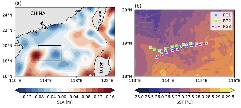 图:(a) 2018年4月25日南海北部海平面异常(SLA;阴影)。方框表示观测区域。 (b) (a)中同一天的海面温度(SST;阴影)和 SLA(等值线)。蓝线、绿线和红线分别代表PG1、PG2和PG3的滑翔机轨迹。每条轨迹上的点表示每天第一次下潜的位置