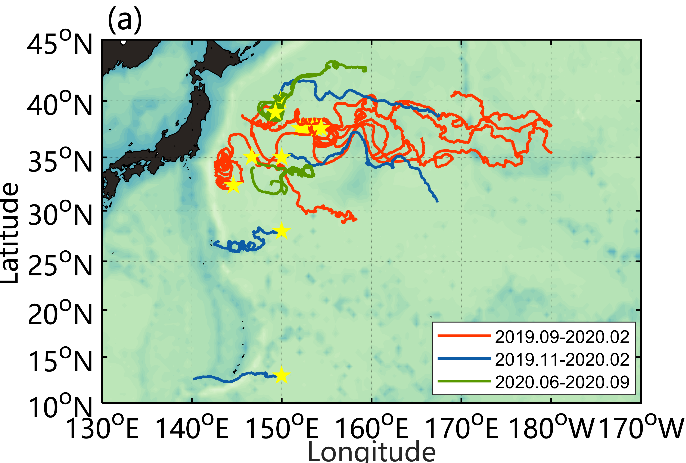 2019年9月份航次,我们在黑潮延伸体海区布放了8套漂流式波浪浮标。其中6套布放在黑潮延伸体主轴北侧的暖涡中,另外2套布放在KEO和CKEO附近。2019年11月份航次,我们在黑潮延伸体和北赤道流布放了4套漂流式波浪浮标。2020年6月,我们在黑潮延伸体布放了4套漂流式波浪浮标。