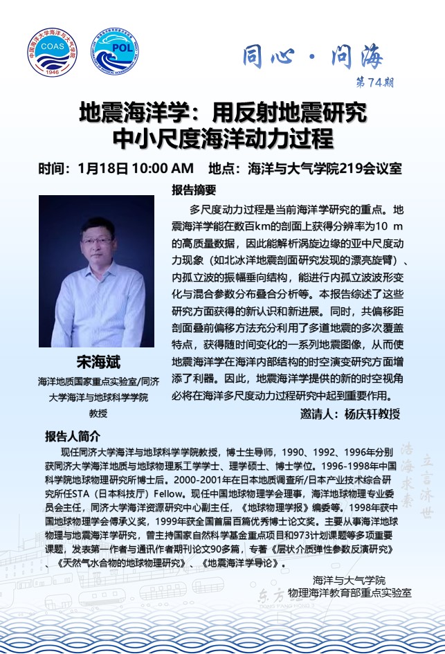 【同心•问海 主题沙龙-74】地震海洋学:用反射地震研究中小尺度海洋动力过程