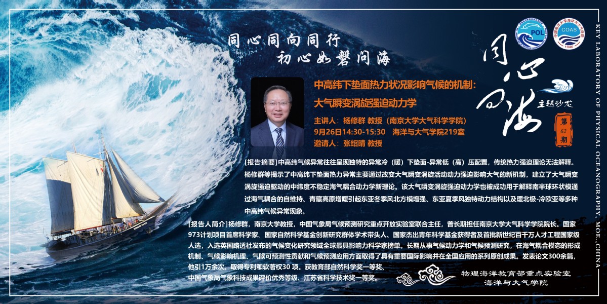 【同心•问海 主题沙龙 71-72】Storm surge hazards along Chinese coasts under the effects of climate change/On the propagation and dissipation of lee waves within ...