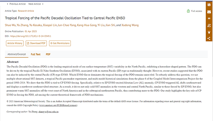 近日,物理海洋教育部重点实验室在Journal of Climate期刊发表题为“Tropical Forcing of the Pacific Decadal Oscillation Tied to Central Pacific ENSO”(《太平洋年代际振荡的热带强迫与中部型ENSO紧密相关》)的最新研究成果,揭示了太平洋年代际振荡的热带强迫部分主要由中部型ENSO主导,而非传统意义上的东部型...