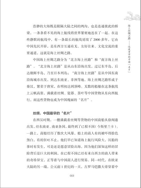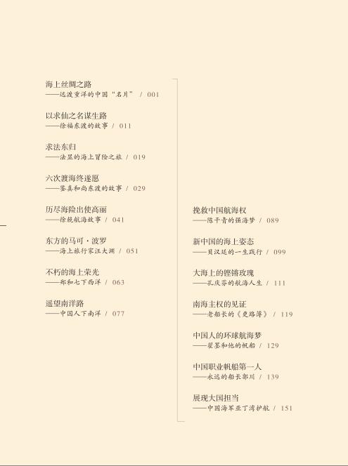 在浩淼的大海之上,有千万艘的船舶正在驶向远方;在万丈的深海之底,有无数个故事正静静地流淌。千百年来,华夏儿女渴望大海的富饶与神秘,不断地出海探索世界,每一次扬帆都怀揣着希望,每一次远航都历经了艰险,每一次归乡都赋予了重生的力量。这些在海洋上寻找、漂泊、战斗的故事一次次地被讲述,讲述是对先辈的致敬,是对英雄的赞扬,更是对中华民族伟大精神的传承。本书选取15个经典的中国航海故事,从秦始皇、海上丝路、法显求法东归、徐福东渡海上求仙、鉴真东渡、东方马可波罗汪大渊、郑和七下西洋、徐兢出使高丽、中国人“下南洋”、明代郑和下西洋,永远的船长郭川,到展现大国担当的中国海军亚丁湾护航舰队,讲述我们对浩瀚海洋的向往之情。