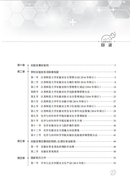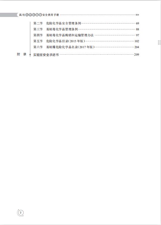 本书包括了实验室安全教育的重要性、实验室事故案例、学校实验室各项规章制度、实验室常见事故的预防和处理、实验室常规教育、实验室安全管理国家相关文件、实验室安全承诺书等几部分内容。重点列出了上级主管部门、学校及学院针对实验室安全管理出台的各种管理制度,各种操作性极强的规程,及常见事故的应急处理。本书针对性较强,适用于化学相关学科实验室。