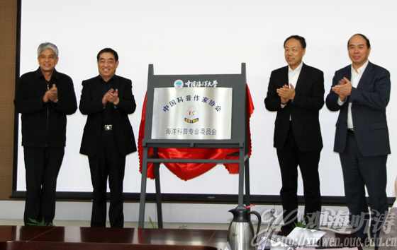 石顺科秘书长(左一)、盖广生主任(右二)、吴德星主任委员(左二)、吴常文院长为海洋科普专业委员会揭牌