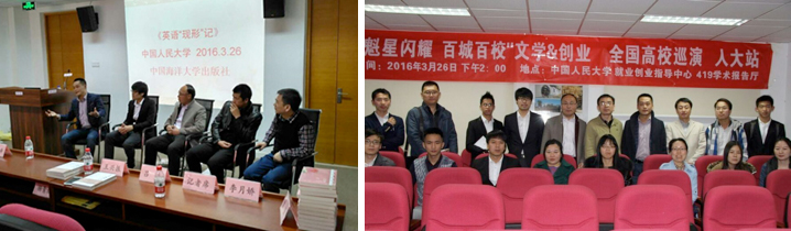 2016年3月26日下午2点,“魁星闪耀 百城百校”文学&创业全国巡讲暨高校发布会在中国人民大学就业创业指导中心417学术报告厅举行,《英语“现形”记》作者释之(本名王兴振)受邀作为嘉宾分享新书情况。活动由作家出版社、开云电竞网址出版社主办,中国人民大学金融协会、中国人民大学创业协会承办,释之工作室和阿特拉斯读书会协办,北京魁星世纪文化传媒有限公司和北京道创科技企业孵化器联合冠名。