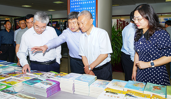 于志刚校长(前排左一)陪同邬书林常务副理事长(前排左三)参观“心中有蔚蓝”主题展览