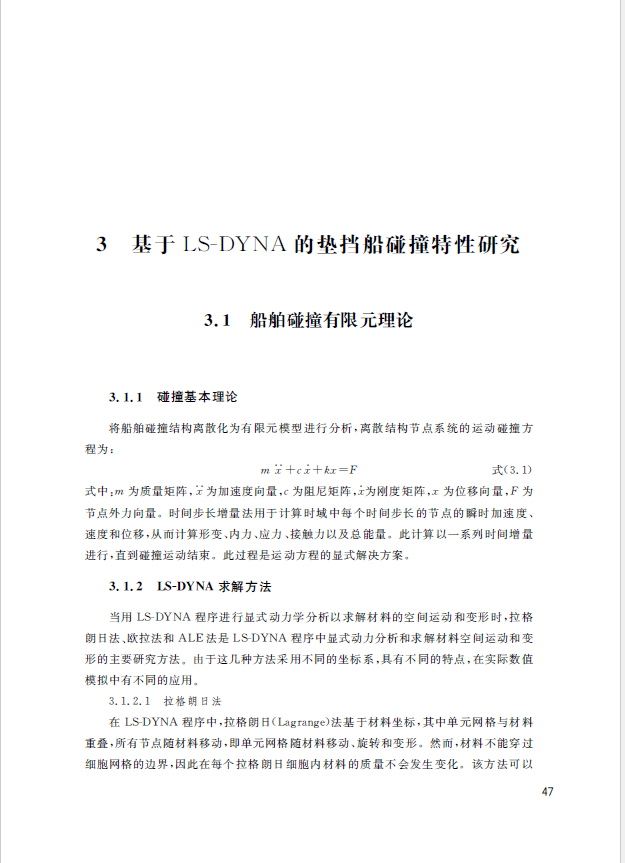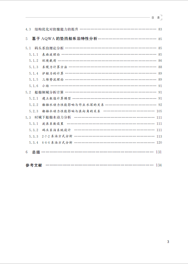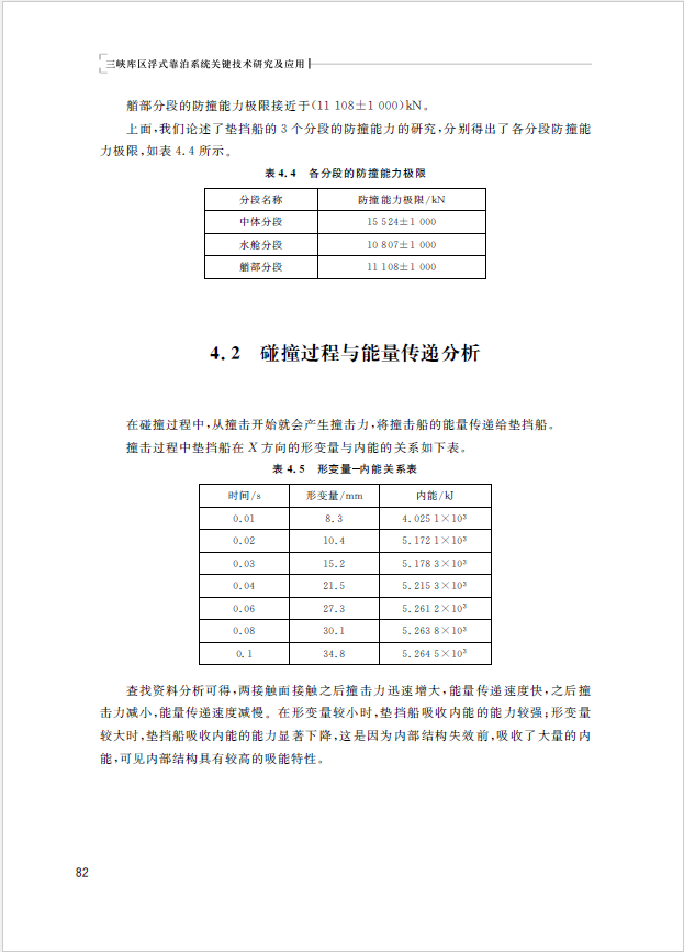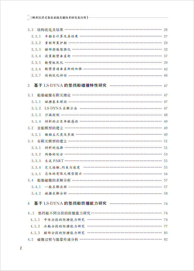 该书选取三峡库区重庆段纳溪沟码头浮式靠泊系统的垫挡船为主要研究对象,参考现有资料,运用结构有限元分析软件对该船进行完整建模,结合实际调研资料,确定船舶的速度、角度及撞击力等数据物理参数,结合垫挡船在高桩码头的布置位置以及固定侧护舷布置位置,确定边界条件,提出可行性结构强度优化方法。同时,通过CATIA V5软件按照设计图纸对垫挡船建立模型,然后应用ANSYS/LS-DYNA对模型网格划分,研究其防撞能力,分析垫挡船钢结构抵御外力的极限能力。