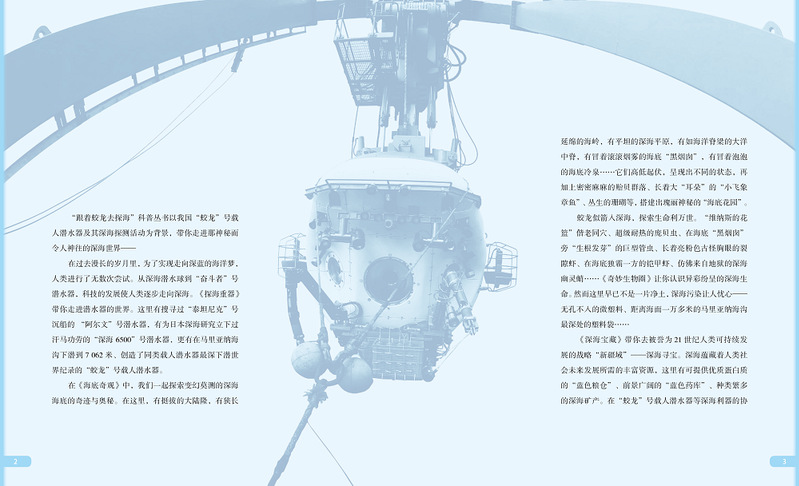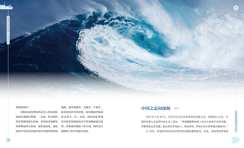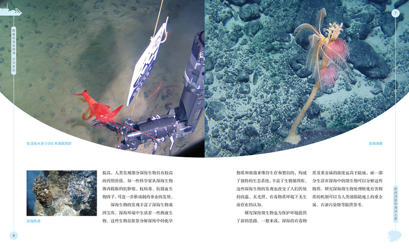 《深海宝藏》图文并茂地展示了深海生物和矿产资源。其中,深海生物资源部分包括深海食品生物资源与深海药用生物资源,深海食品生物资源以生动的语言描述了有代表性的可食用深海鱼、雪蟹等生物,深海药用生物资源较详细地总结了深海鱼类、海绵等生物及来自这些生物的代表性药物。涉及热点“蓝色粮仓”与“蓝色药库”、深海养殖、深海生物基因资源的研究开发。而深海矿产资源部分则较详细地展示了海底石油和天然气、可燃冰、多金属结核、富钴结壳、多金属硫化物、深海稀土的形成、分布、开采与利用,深入浅出。