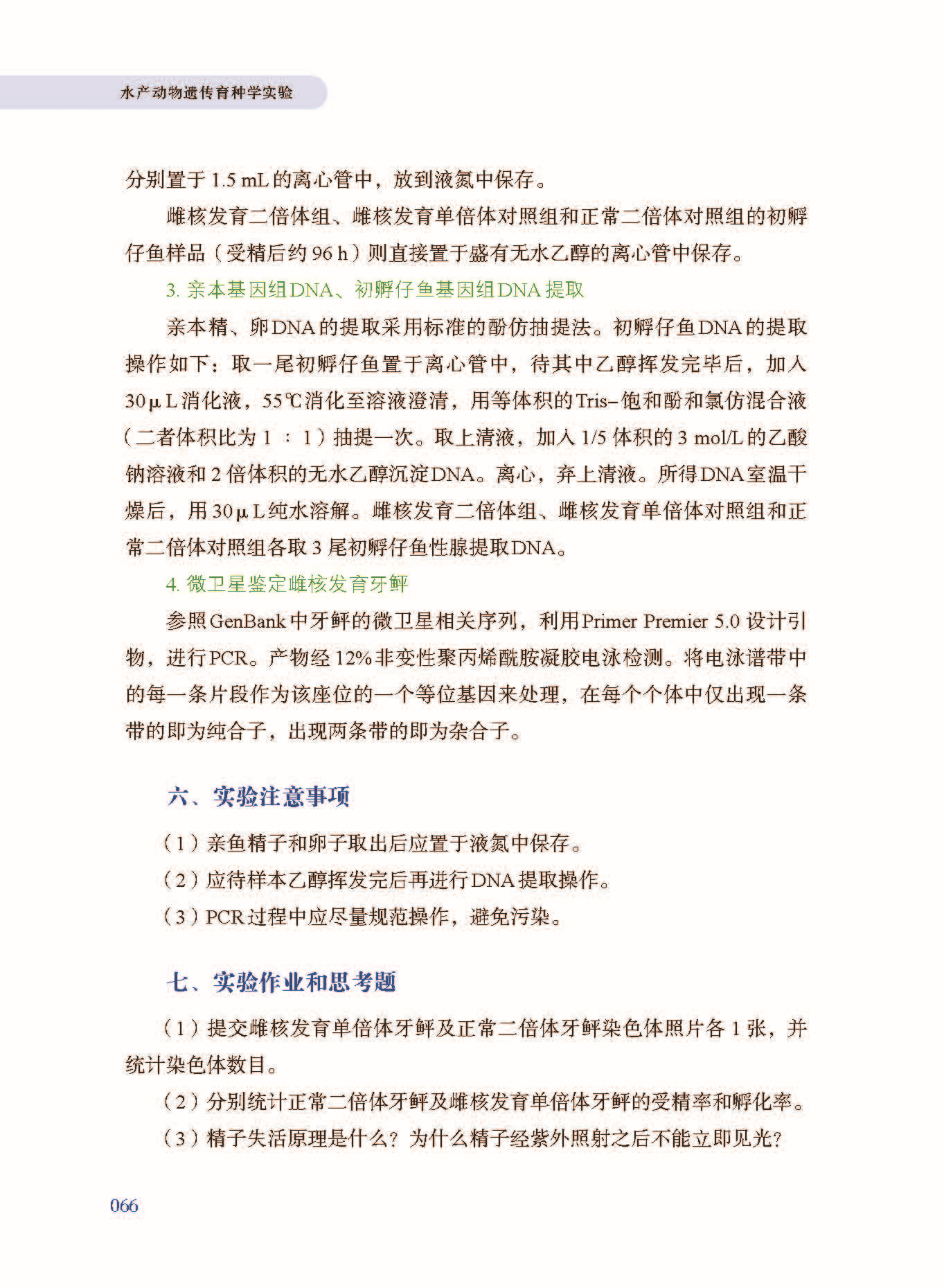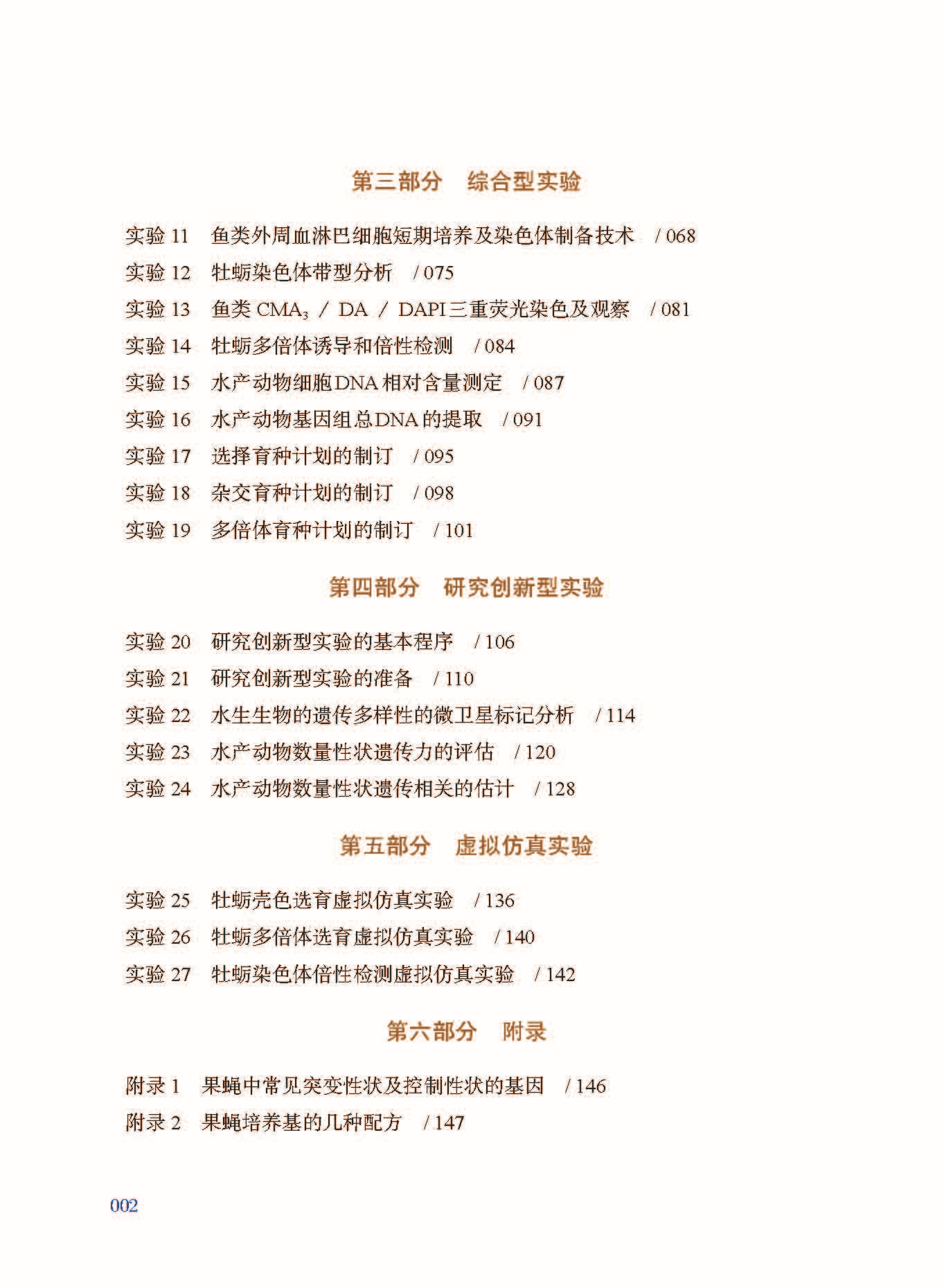 本书根据水产养殖专业最新教学计划和课程大纲编写,分总论、基础型实验、综合型实验、研究创新型实验、虚拟仿真实验和附录6部分,包括27个实验项目,涉及经典遗传学实验、细胞遗传学实验、分子遗传学实验、数量遗传学和育种学实验设计等,实验内容由浅至深,易于理解和掌握。除基础型实验使用遗传学经典实验材料外,其他实验项目均以水产动物为实验材料。另外,书中附有部分实验操作的视频,读者扫描书中相应的二维码即可观看。本书适用于水产养殖、水族科学与技术、水生动物医学专业,也供动物科学等专业参考。