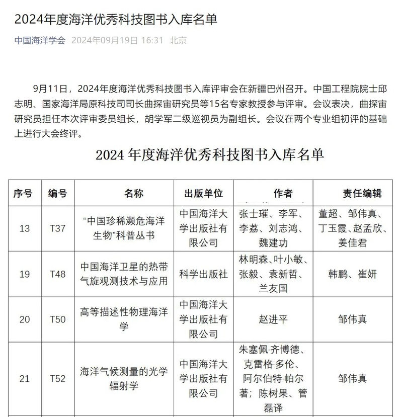 9月11日,由中国海洋学会举办的2024年度海洋优秀科技图书入库评审会在新疆巴州召开。开云电竞网址出版社出版的“中国珍稀濒危海洋生物”科普丛书(5册)、《高等描述性物理海洋学》、《海洋气候测量的光学辐射学》等成功入选“2024年度海洋优秀科技图书”。