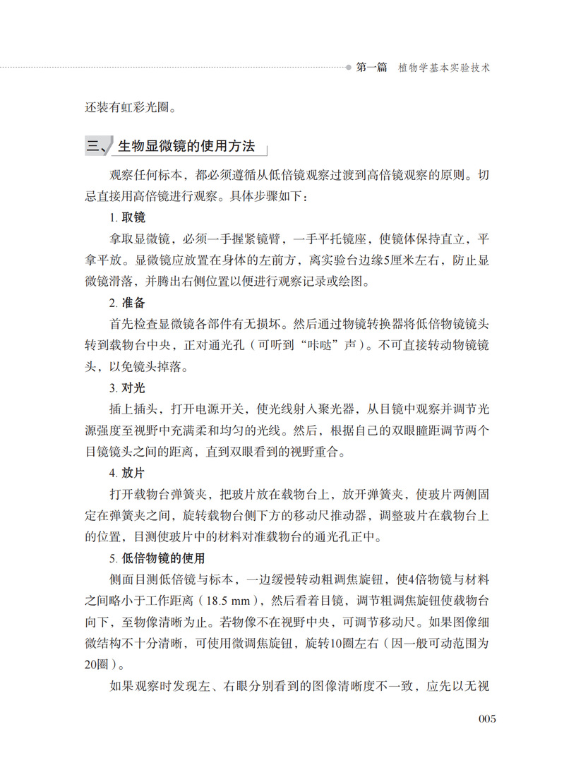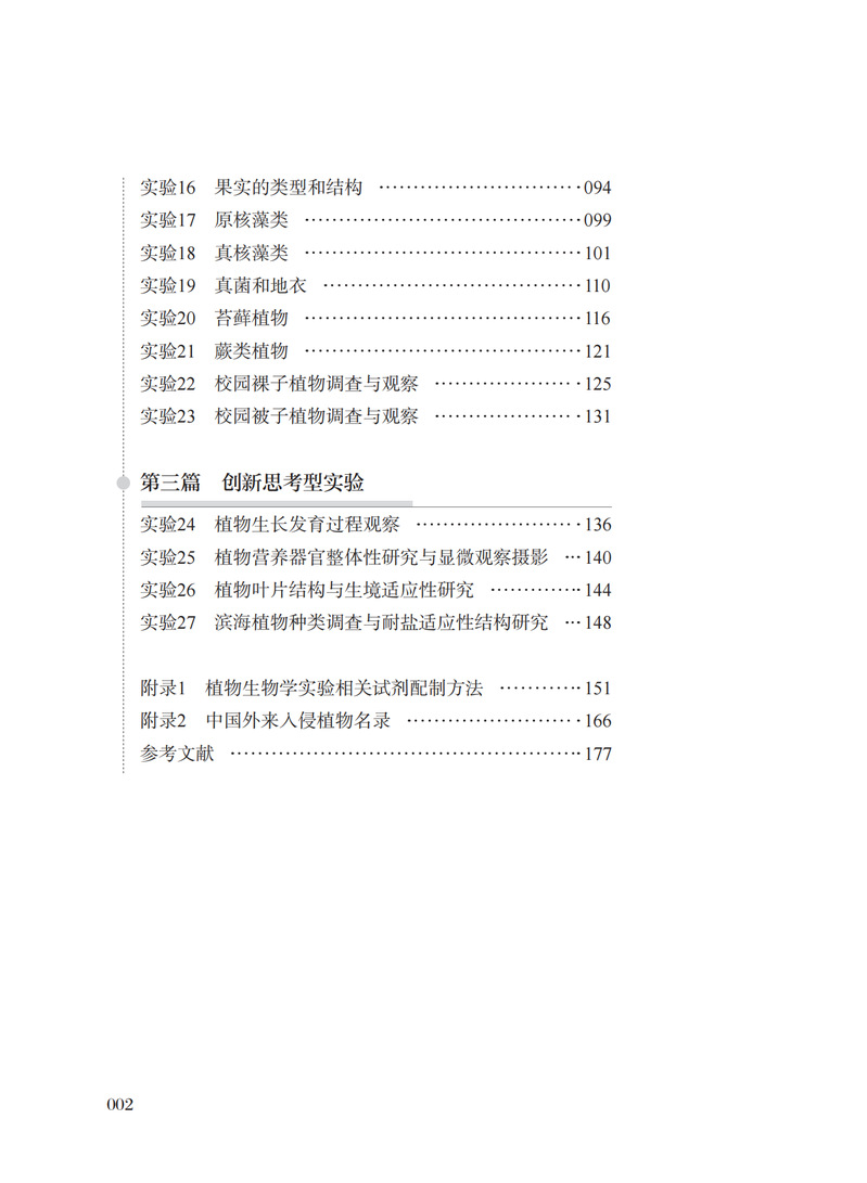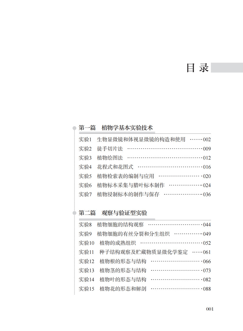 本书包括植物学基本实验技术、观察与验证型实验、创新思考型实验共27个实验以及2个附录。实验设计涵盖了植物学形态解剖、生长发育、标本采集与制作、物种调查与环境的关系等方面,在训练学生掌握植物学基本实验技能、进行基础观察与验证的基础上,还增添了具有综合创新性思考的实验内容,以培养学生观察、分析与解决实际问题的综合能力。每个实验由实验目的与要求、实验材料及用品、实验内容和方法、作业和思考题等几部分构成。附录包括植物学常用试剂及染色液的配制方法和中国外来入侵植物名单,便于在实验和实习调查过程中查阅及应用。本书可作为各类高等院校相关专业大学本科植物学实验课程教材,也可作为广大植物学工作者和爱好者的参考书。