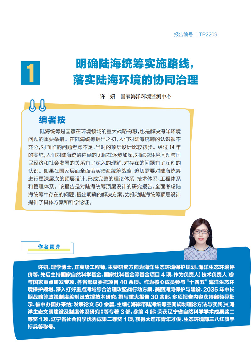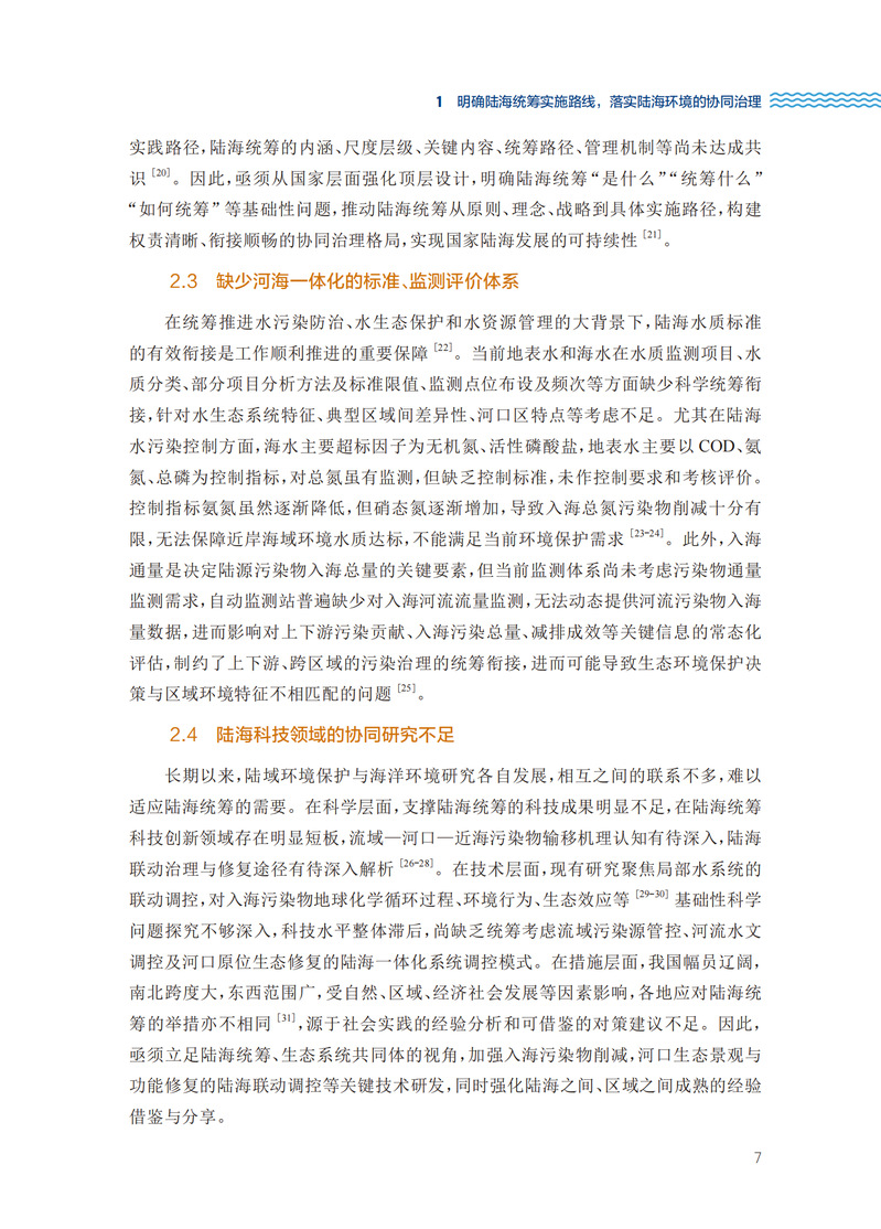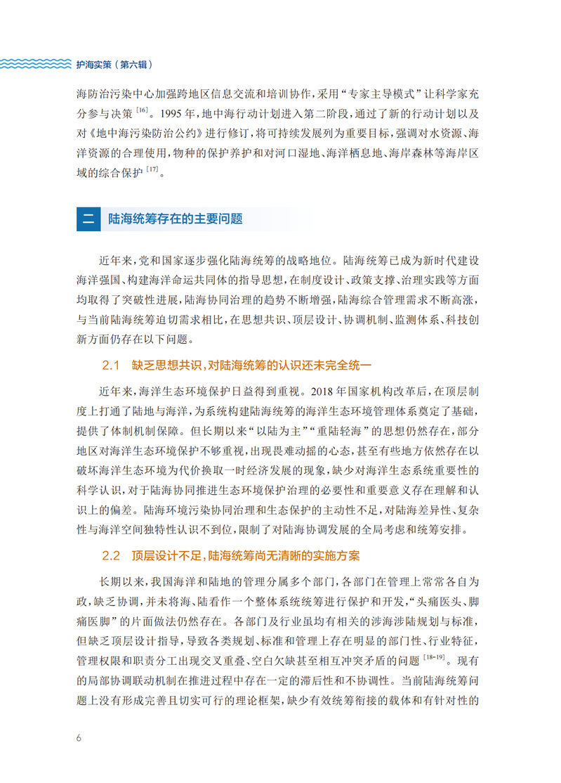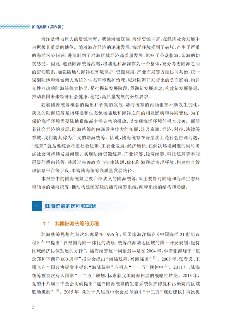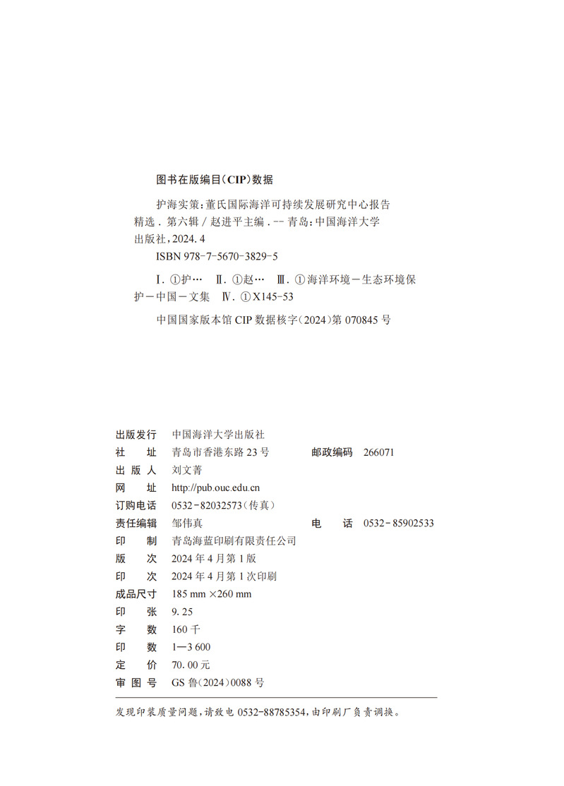 本书为董氏国际海洋可持续发展研究中心的研究报告集——护海实策(第六辑),主要包含我国海洋可持续发展的优秀研究成果。第六辑围绕如何尽快推动我国实现陆海统筹,保护近海海洋生态环境提出了切实可行的对策建议。主要包括:明确陆海统筹实施路线,落实陆海环境的协同治理;实施入海河流物质动态监测,有效支撑陆源污染防治;建立河口水质基准和标准体系,有助于推动陆海统筹;陆海统筹的历史和存在的问题;基于陆海统筹的近海生态环境监测体系及数据管理;贫营养化的警示——近海营养物质的科学管控对策。本书的读者范围很广,包括相关各级政府部门、相关高校和研究机构、相关智库,还包括海洋渔业、海洋石油业、海洋生态与环境等相关企业。