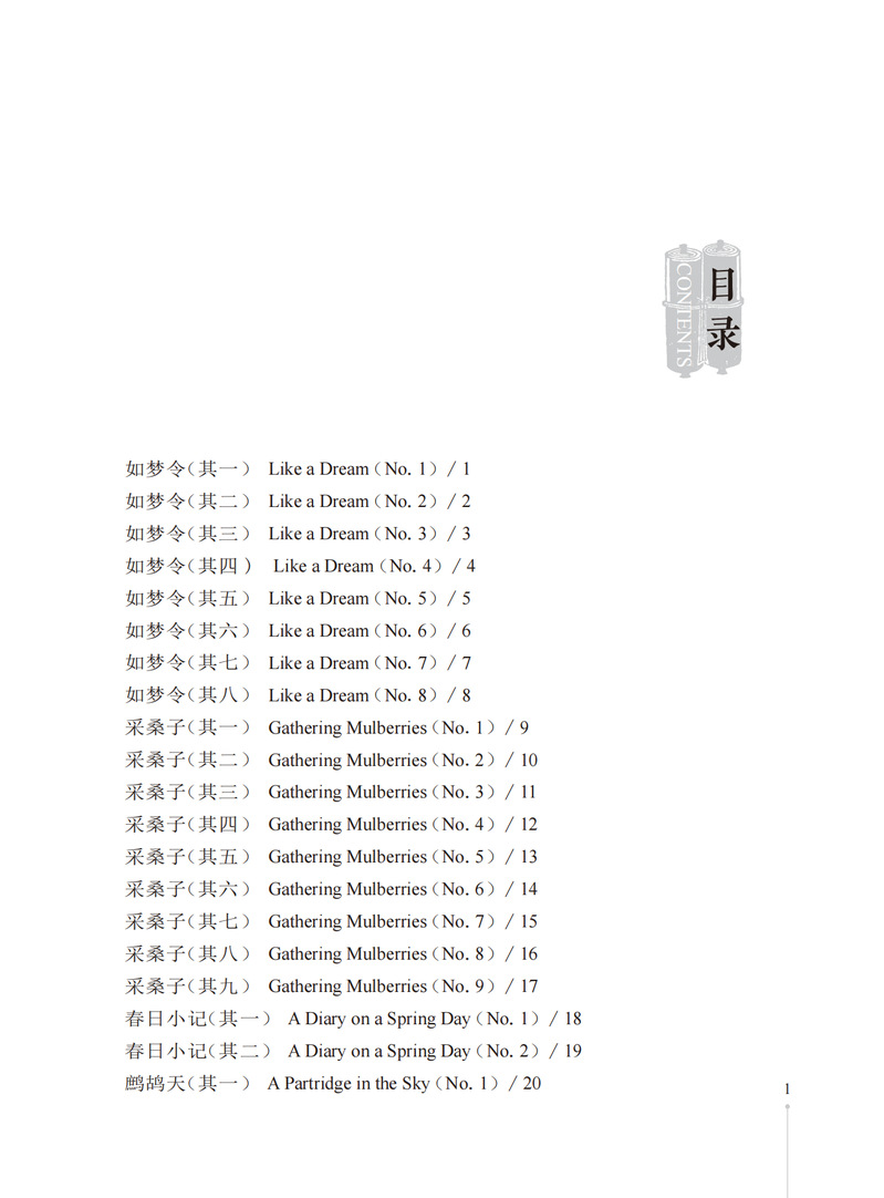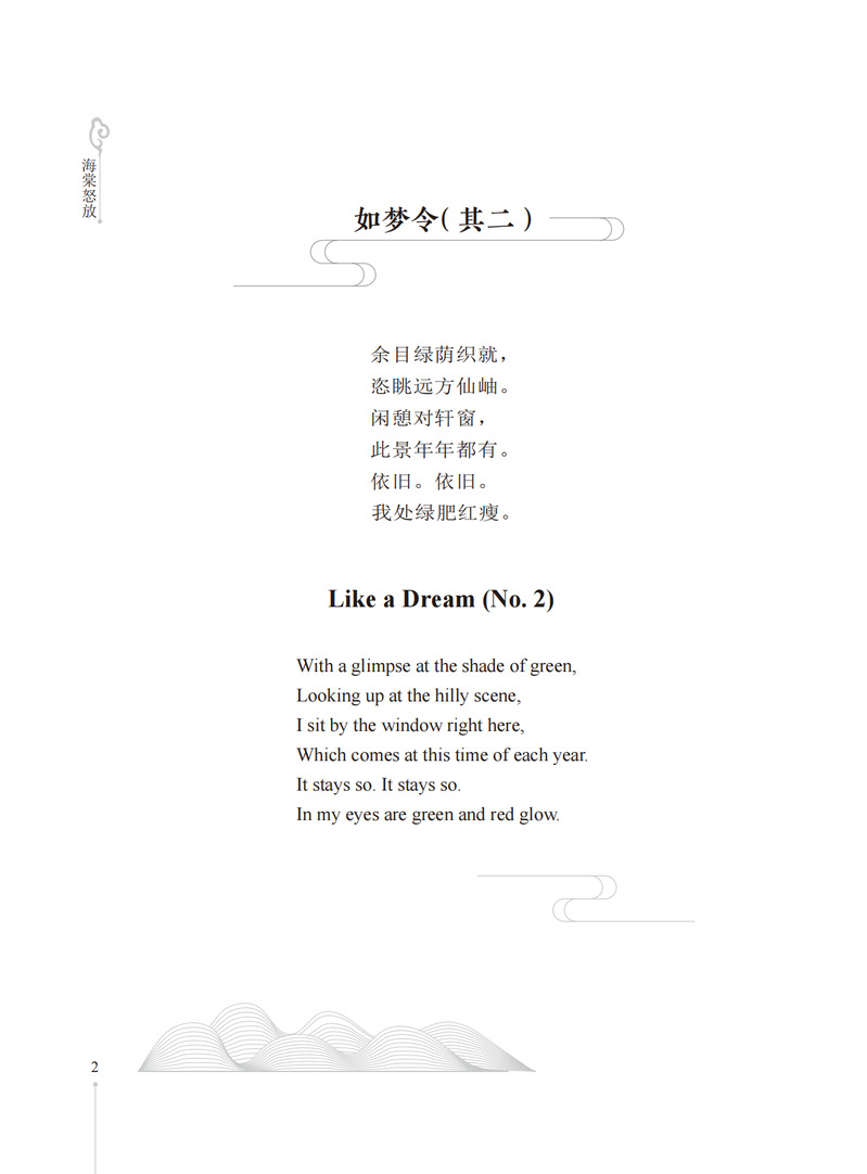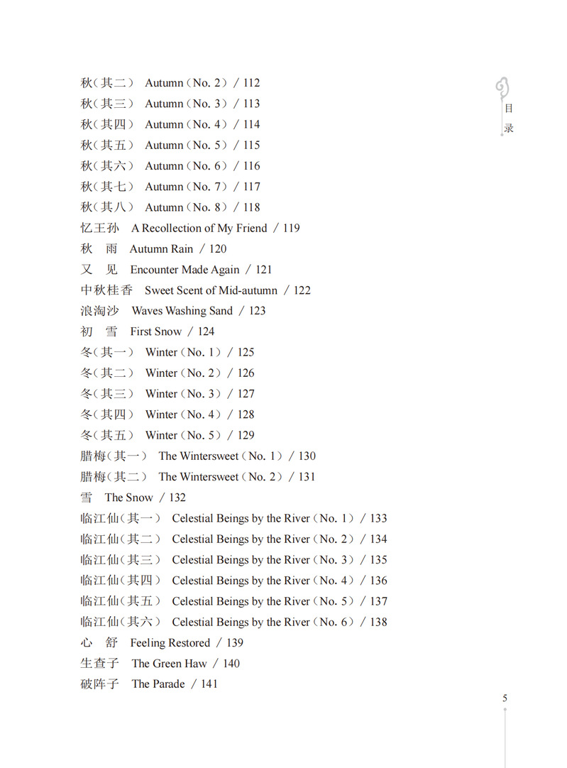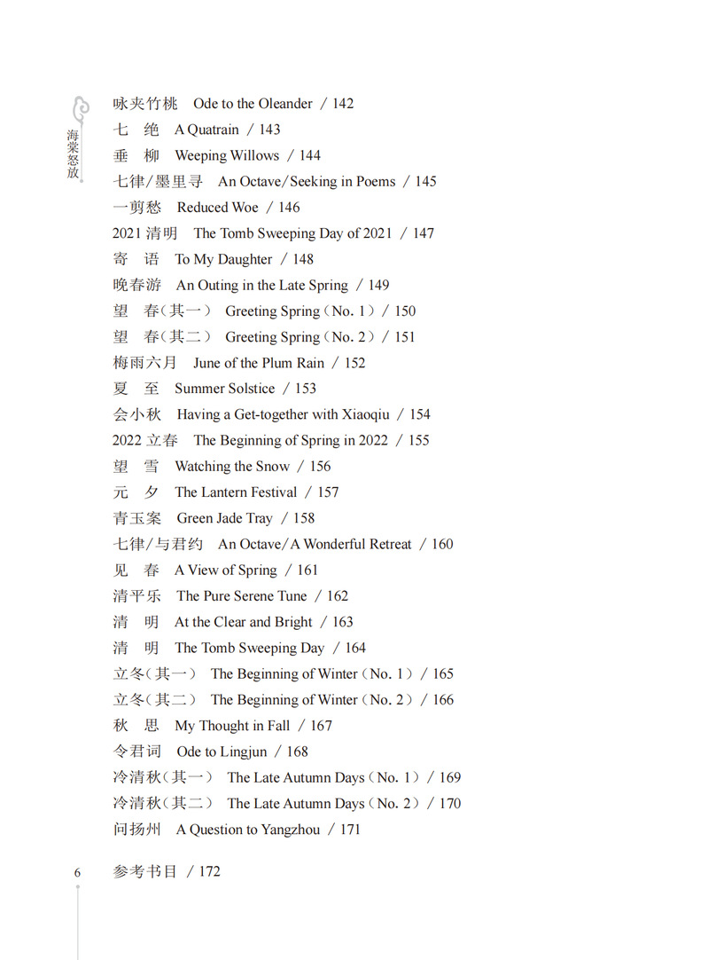 本书收录作者所作的171首格律诗词及其英文译诗。本书的诗词内容涉及五言、七言、五绝、七绝与七律以及“忆江南”“采桑子”等多种词牌,包含咏诵四季景物、怀人等主题,是对作者生活、情感、思想的笔录与注疏;英文译文以“以诗译诗”的形式呈现,译诗同样讲求格律与韵,韵格形式多为“aabb(cc...)”“abab(cdcd...)”,也有“aaba”,以及“aaaa”格式。本诗词选集是自创自译的格律体中英文双语诗集,既包含作者创作的格律诗,亦附上作者自译的“以诗译诗”体的英文译诗。