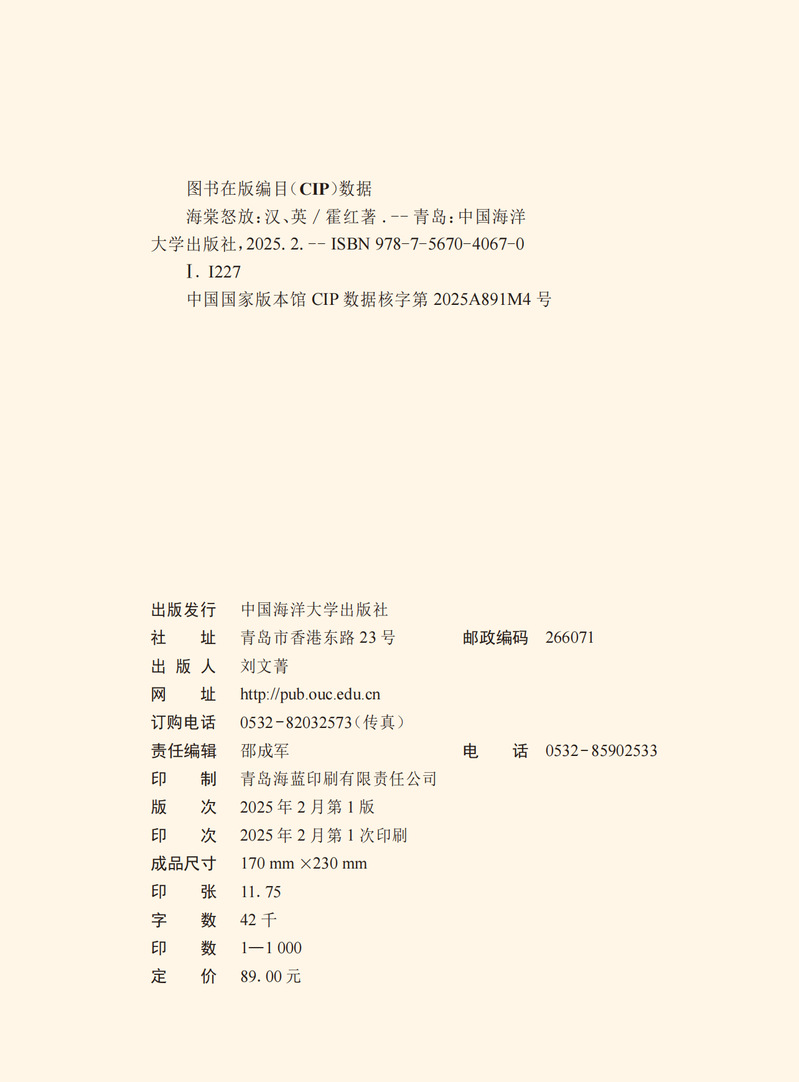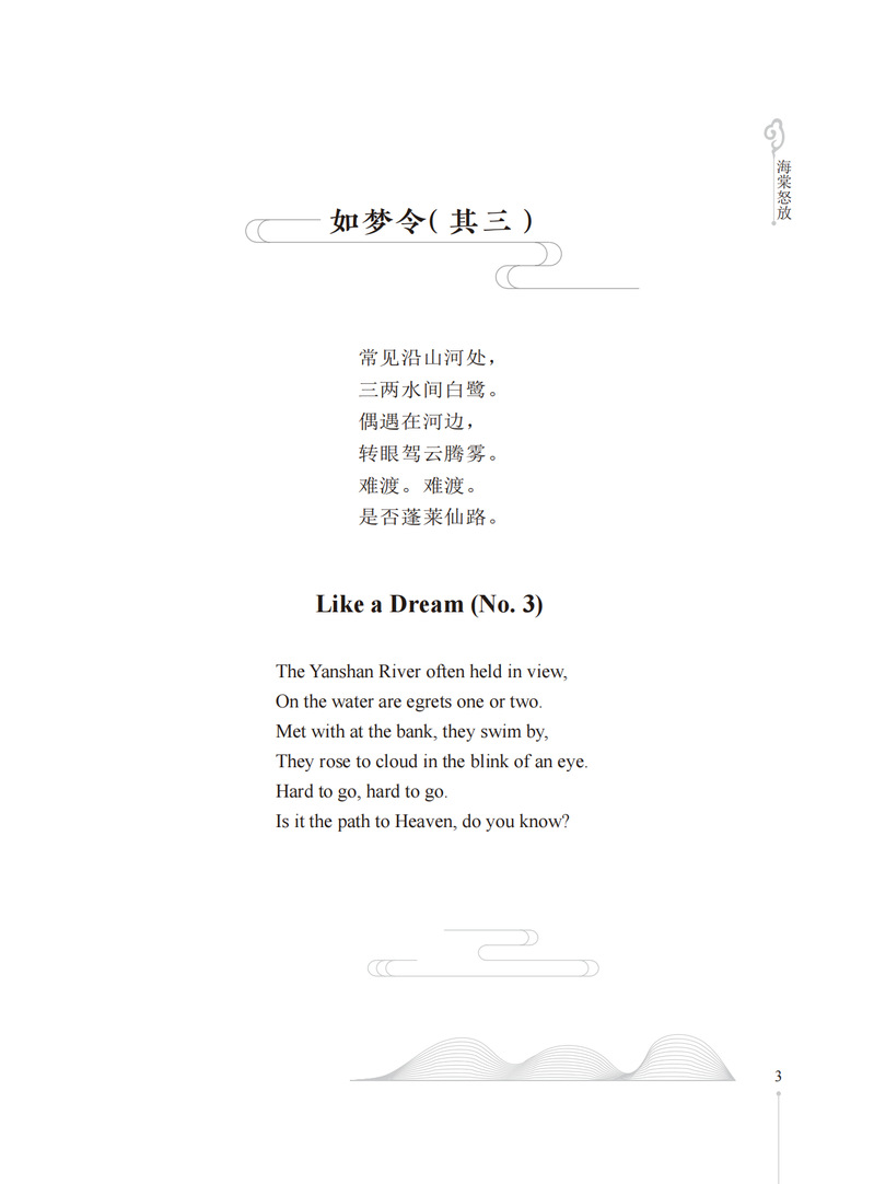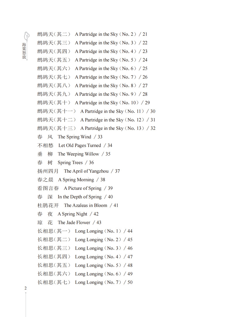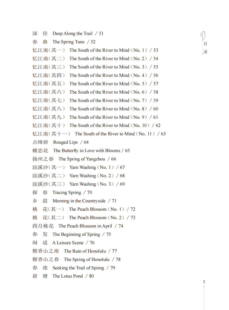本书收录作者所作的171首格律诗词及其英文译诗。本书的诗词内容涉及五言、七言、五绝、七绝与七律以及“忆江南”“采桑子”等多种词牌,包含咏诵四季景物、怀人等主题,是对作者生活、情感、思想的笔录与注疏;英文译文以“以诗译诗”的形式呈现,译诗同样讲求格律与韵,韵格形式多为“aabb(cc...)”“abab(cdcd...)”,也有“aaba”,以及“aaaa”格式。本诗词选集是自创自译的格律体中英文双语诗集,既包含作者创作的格律诗,亦附上作者自译的“以诗译诗”体的英文译诗。