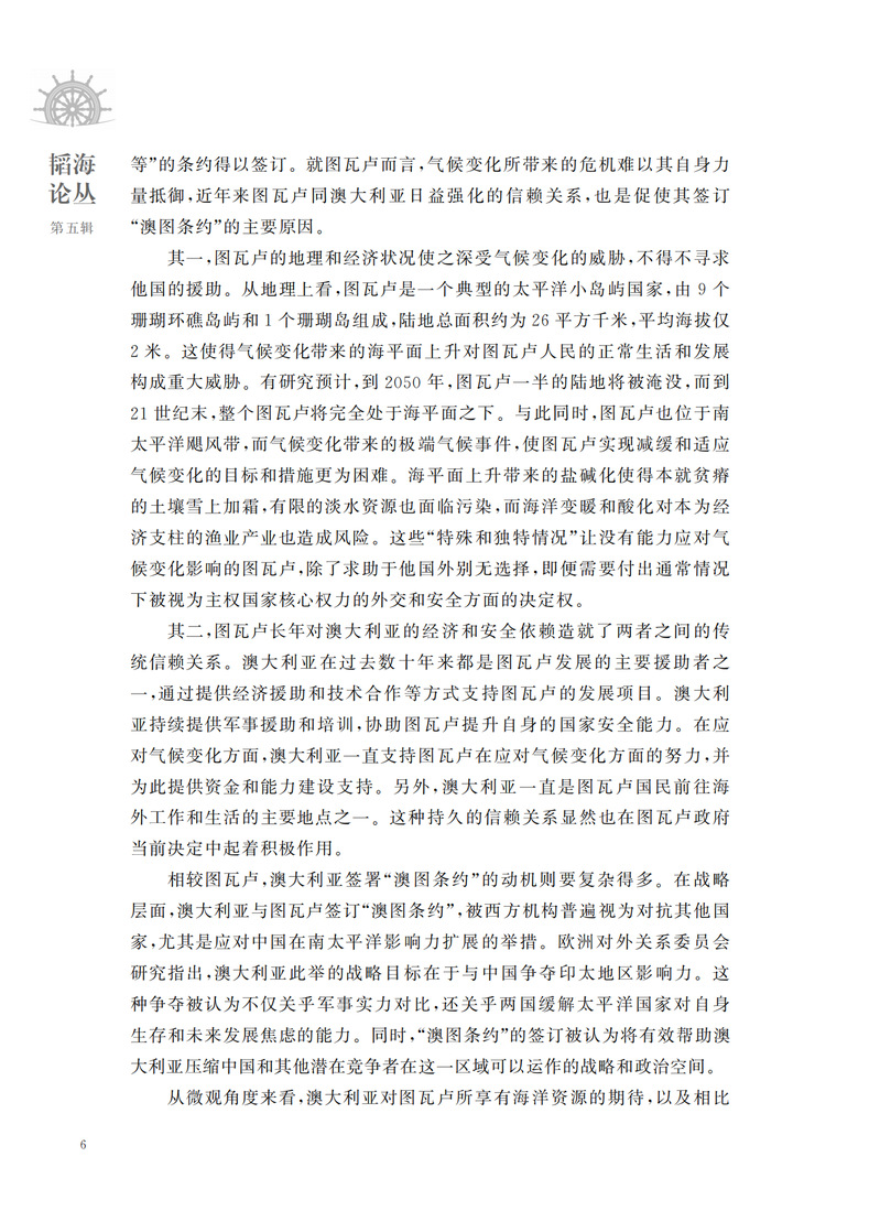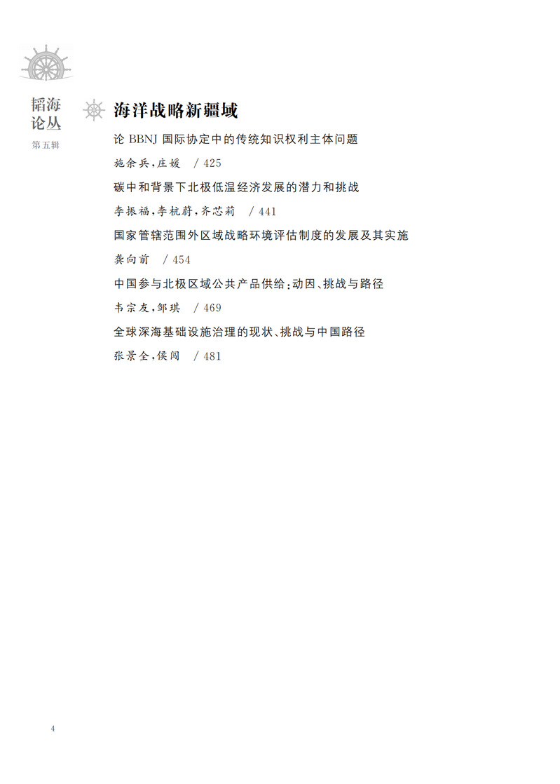 “韬海论丛”系列丛书,旨在从多角度、多领域探讨我国海洋方面具有全局性、前瞻性、关键性的问题,从多角度反映专家观点,为关心海洋领域研究的专家学者、涉海专业学生提供最新的信息资讯、优质的研究成果。《韬海论丛 第五辑》内容拟按照“全球海洋治理”“海洋法治建设”“海洋环境保护”“海洋产业发展”“海洋软实力”“海洋战略新疆域”六个专题,择选已刊发的优秀研究成果,撷取核心观点,梳理编纂,汇集成册。本册内容上,以六个热点研究方向为专题设计全书内容。在形式上,每一篇文章设计“论点撷萃”,选取文章的核心观点,突出中心。