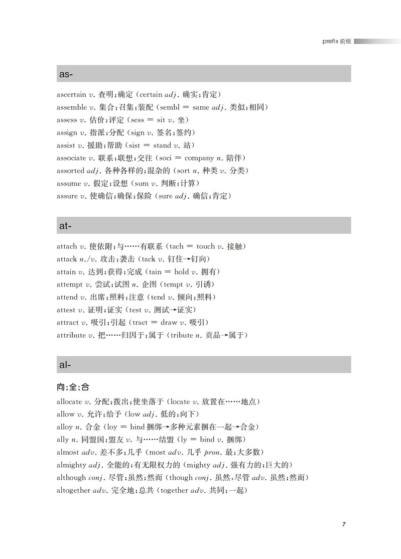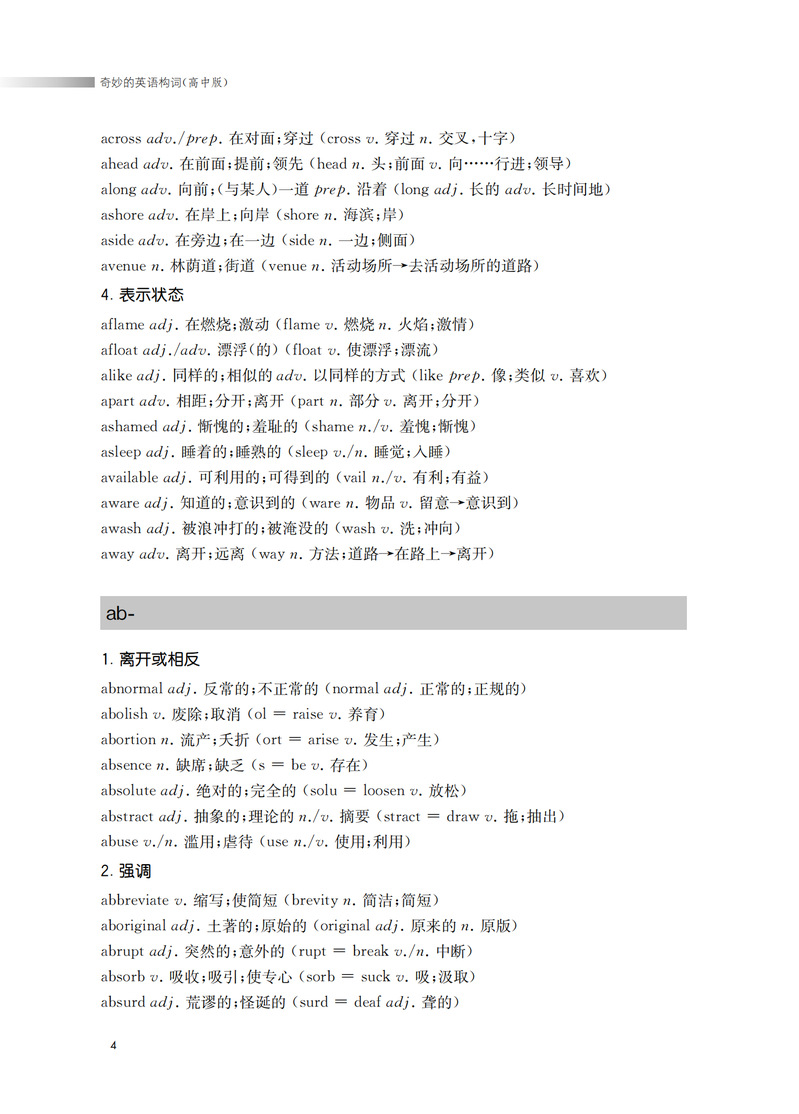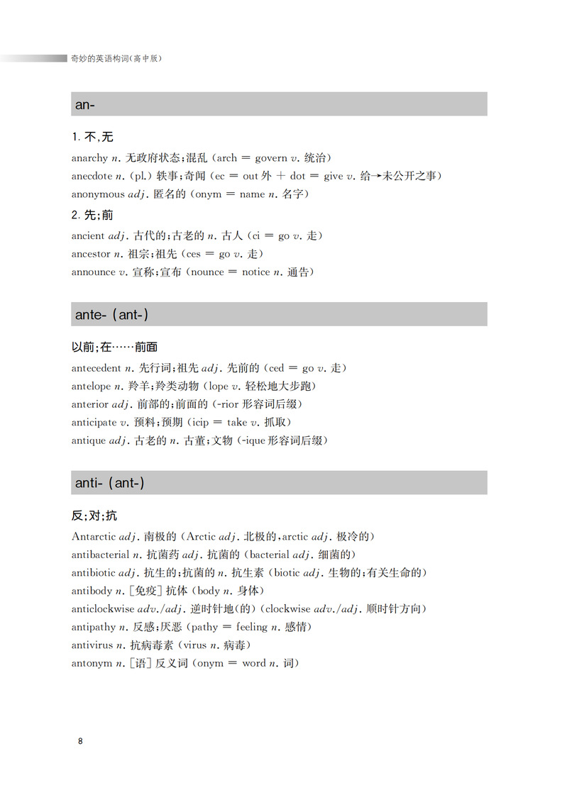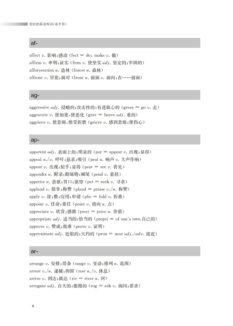 本书从构词法入手,揭示英语单词的内在构词规律。重在引导中学生遵循词根词缀的构词规律,以熟词引出新词的方法,快速、准确地记住单词。本书第一部分是词根。词根是单词的核心。一个词根可以引出与之相关的一串单词。了解一个词根就能记住一群单词。快速提高词汇量。第二部分是词缀。(前缀和后缀)均为常用的词缀。配以中学英语中的高频词汇,加深学生的记忆,让学生不再为记不住单词而苦恼。前缀改变单词的意义,后缀改变词的语法作用。因此,掌握一定的数量的前缀和后缀,学生能准确运用单词。从而达到从认识到运用的飞跃。