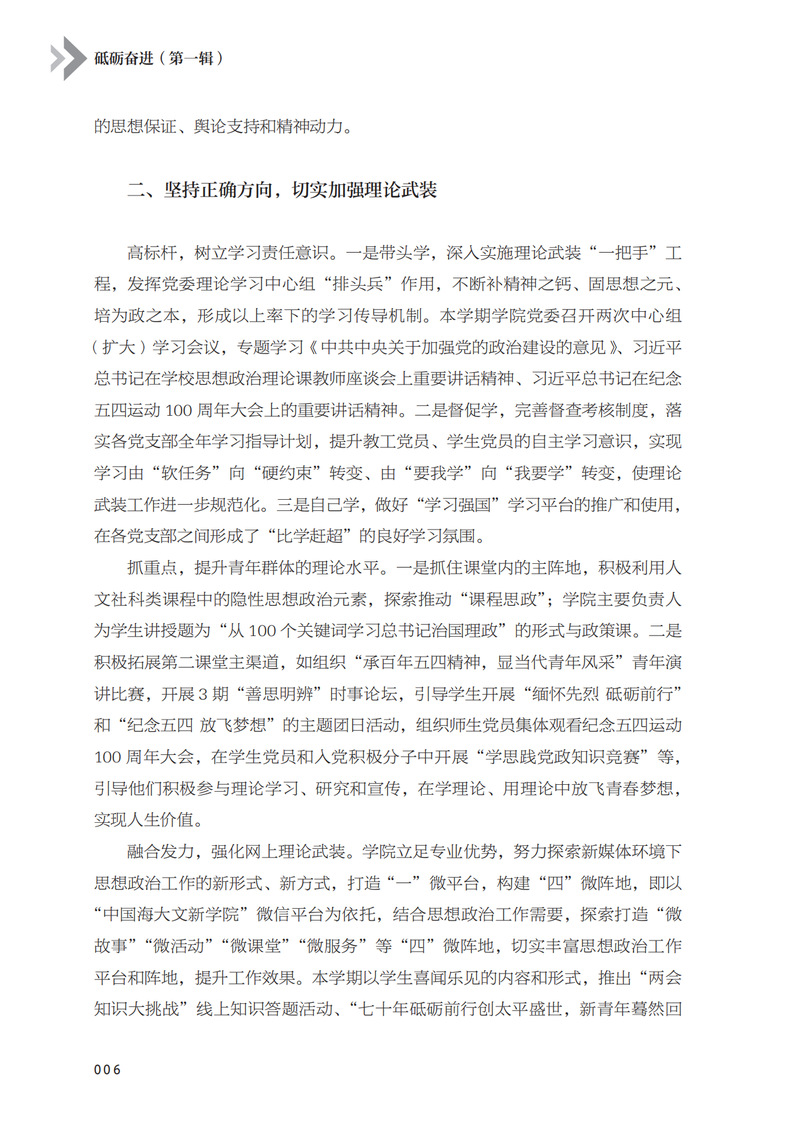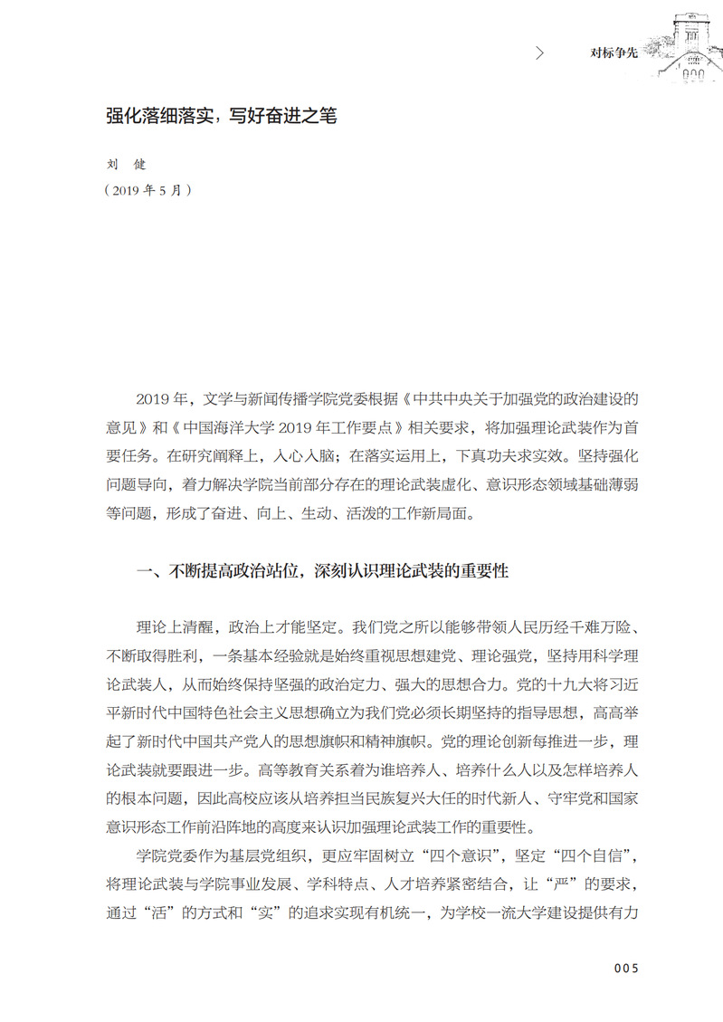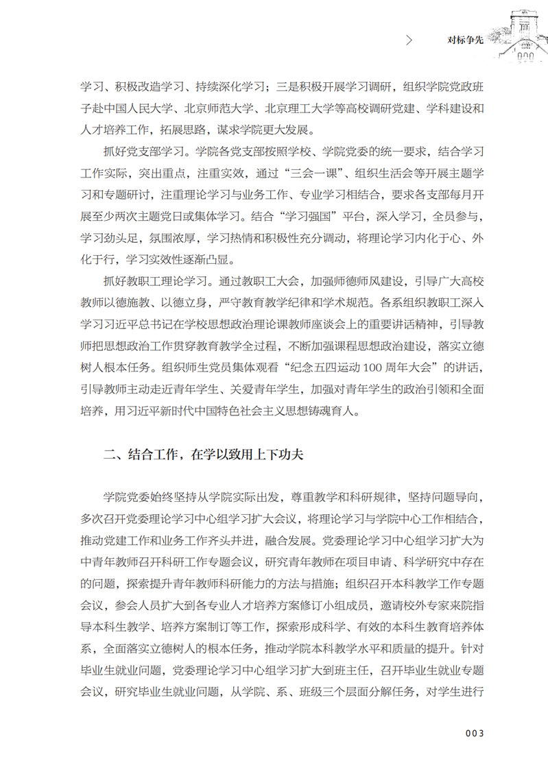 本书聚焦贯彻落实习近平新时代中国特色社会主义思想主题,实时部署、紧跟节奏,从严从实推进“不忘初心、牢记使命”主题教育的成果集。从对标争先、行远风采、院长访谈三个方面展示开云电竞网址党委及各级党支部的理论学习情况、政治实践情况,彰显出其统筹引领、担当作为的风采,呈现出其守初心,筑牢学校建设发展之基;担使命,推动一流大学“奋进之笔”的初心。 收录了开云电竞网址2019年度开展书写开云电竞官网app入口手机版“奋进之笔”行动的发言、访谈成果材料。