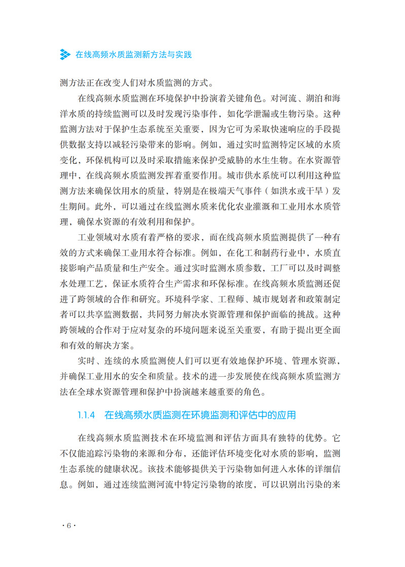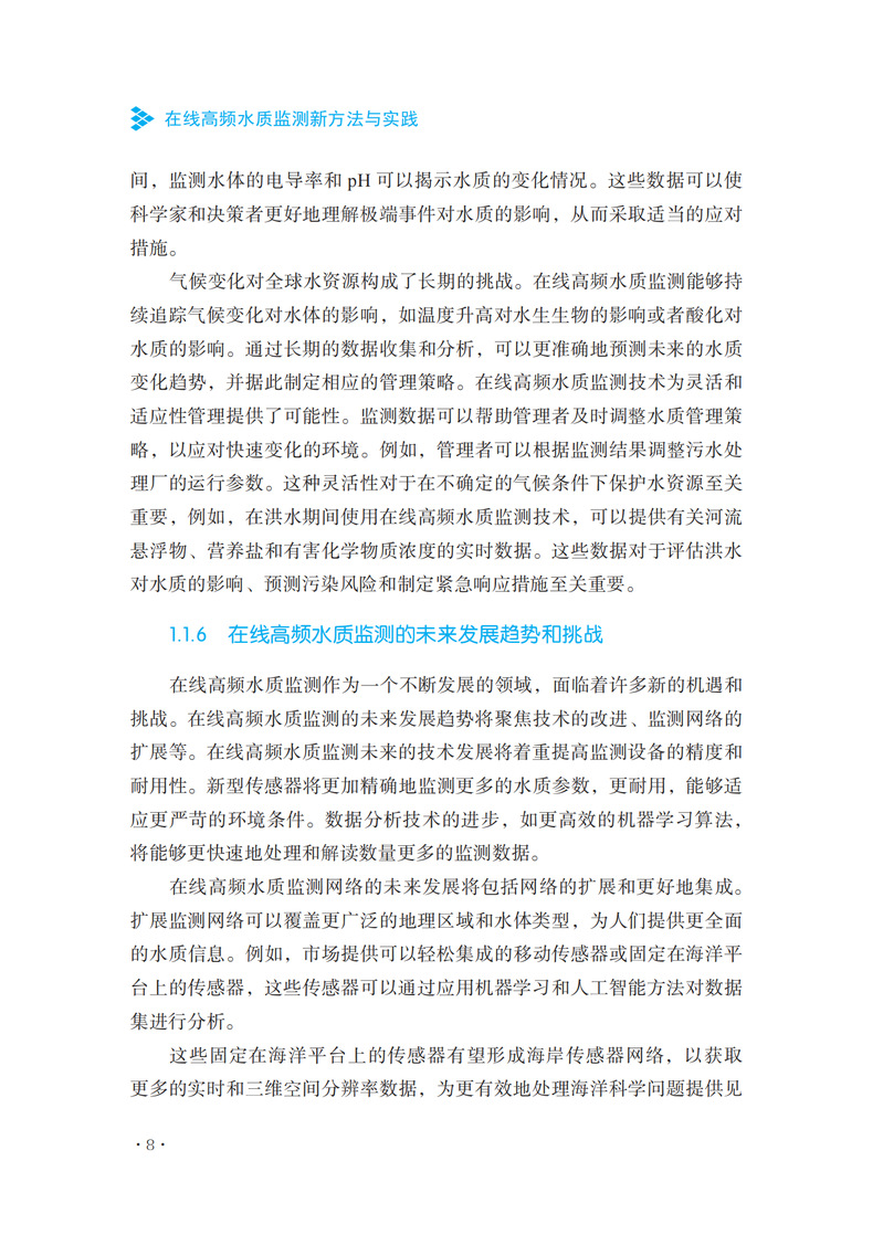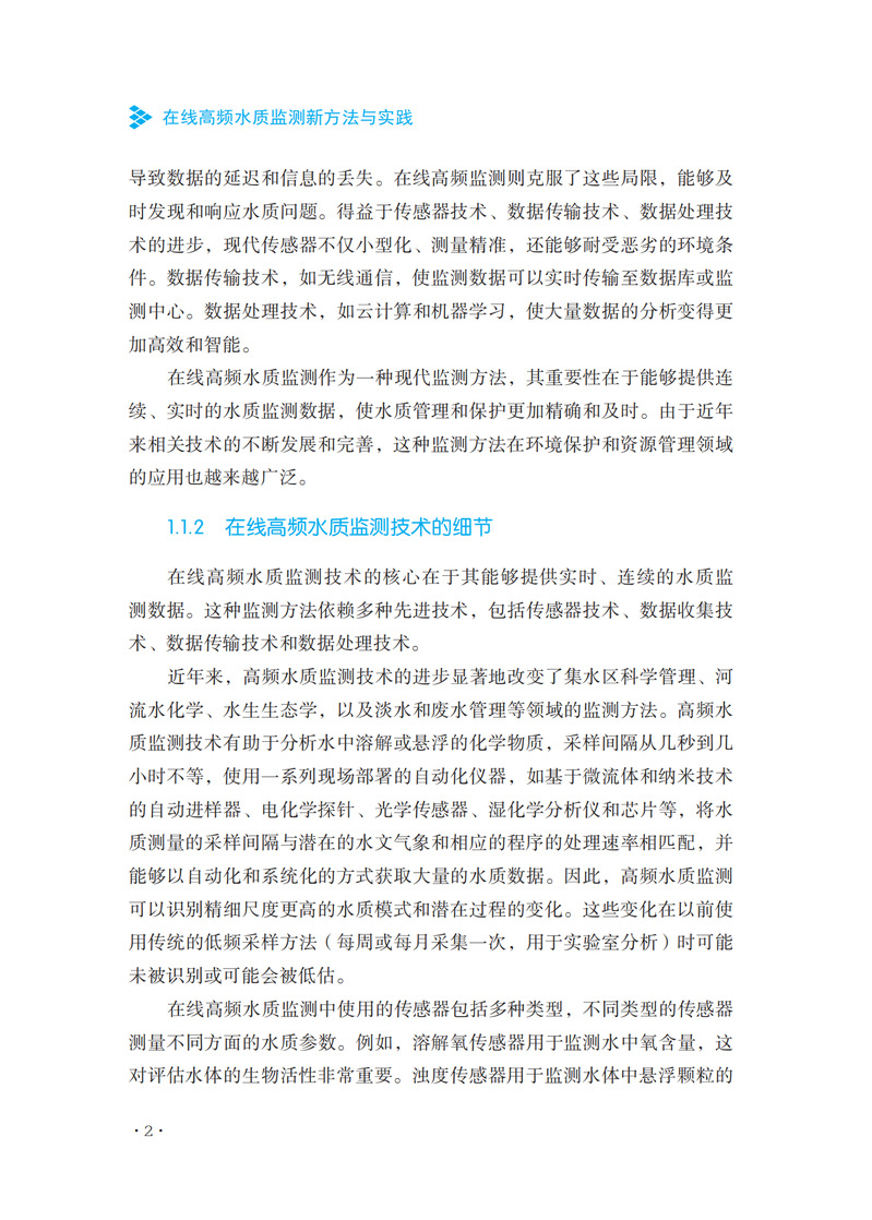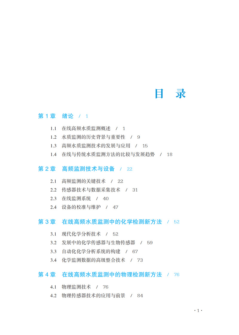 本书是一本全面深入探讨水质监测技术的专业书籍。该书从在线高频水质监测的基本概念入手,详细阐述了这一领域的发展历程和技术进步。全书共分为八个章节,每一章都系统地介绍了高频水质监测的关键方面,包括技术、设备、应用和未来趋势。在前两章中,作者详细介绍了在线高频水质监测的基本概念、历史背景、技术发展以及与传统方法的比较。接着,书中深入探讨了高频率监测技术的关键要素,如传感器技术、数据采集、监测系统的架构设计以及设备的校准和维护。第三章和第四章分别聚焦于化学和物理检测新方法。这些章节不仅介绍了最新的分析技术,还探讨了化学和物理传感器技术的发展,并提供了高效处理监测数据的方法。